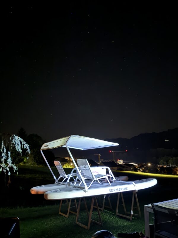 SUPMaRaN je genialna kombinacija dveh napihljivih SUP desk in lahkega, modularnega okvirja iz nerjavečega jekla, ki se v hipu preobrazi v katamaran razreda D (certificiran pri IMCI). Ko vam srce zaželi spet stati na deski, preprosto odpnete trakove in deskam vrnete njihovo prvinsko poslanstvo. A ko si zaželite ustavljivega udobja, s senčnikom nad glavo in kavbojsko sprostitvijo v sedežu, SUPMaRaN v trenutku postane vaš zasebni »living room« na vodi.